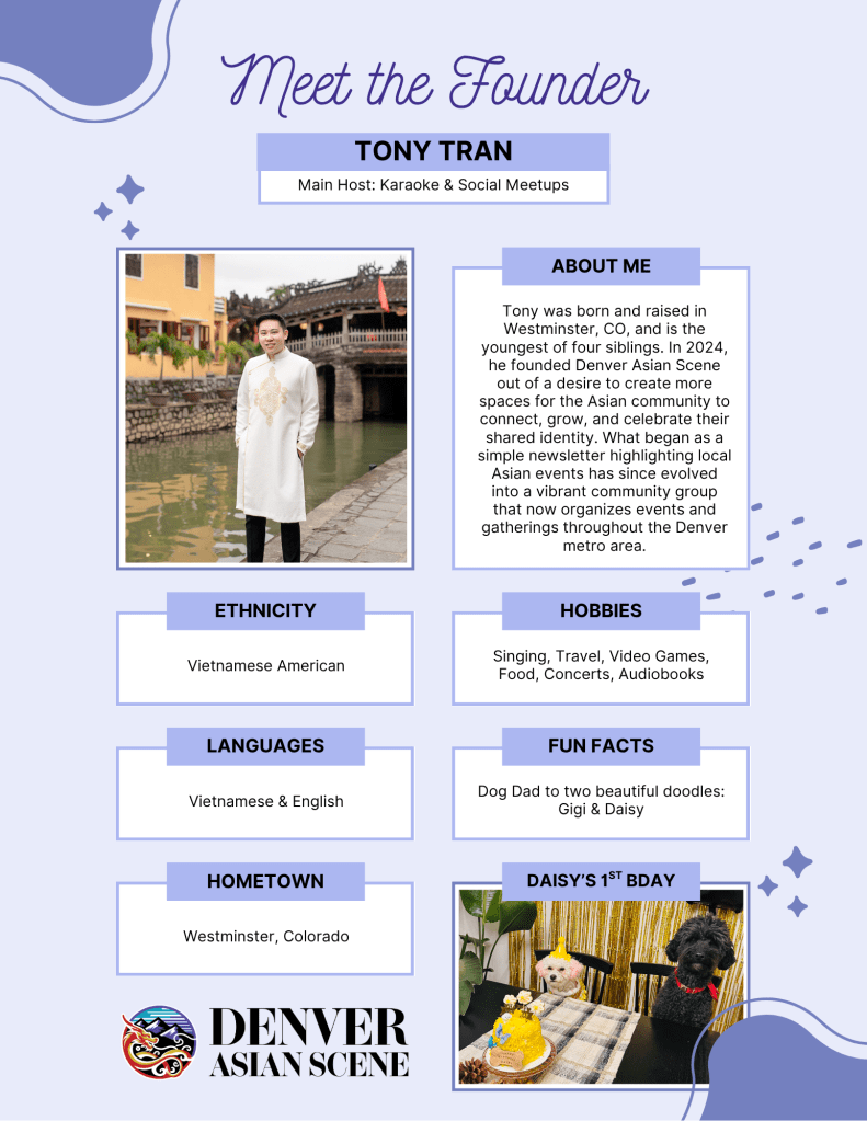 Founded in 2024, Denver Asian Scene (DAS) is an AANHPI community group celebrating culture through events, social gatherings, and local storytelling. The group has about 3,000 followers across multiple platforms, including an e-newsletter and social media. They host weekly events that attract 50-80 attendees.